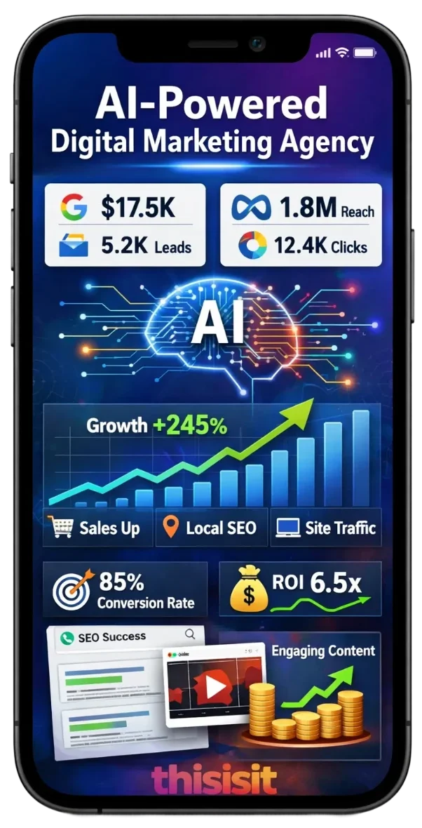 At Thisisit creative AI, we combine artificial intelligence with proven digital marketing strategies to optimize campaigns, improve conversions, and maximize ROI. Instead of guesswork, we focus on performance-driven execution that strengthens brand authority, improves customer engagement, and delivers measurable growth across competitive markets.